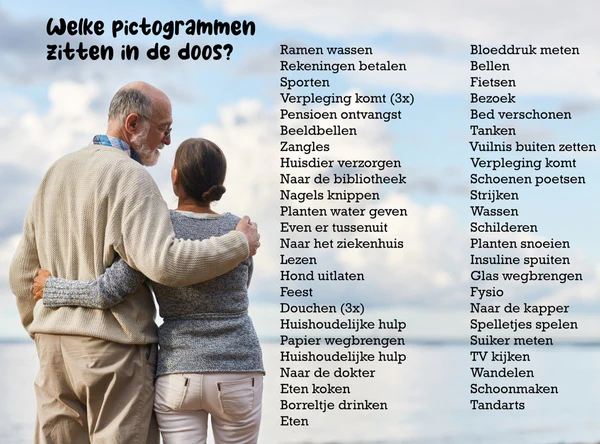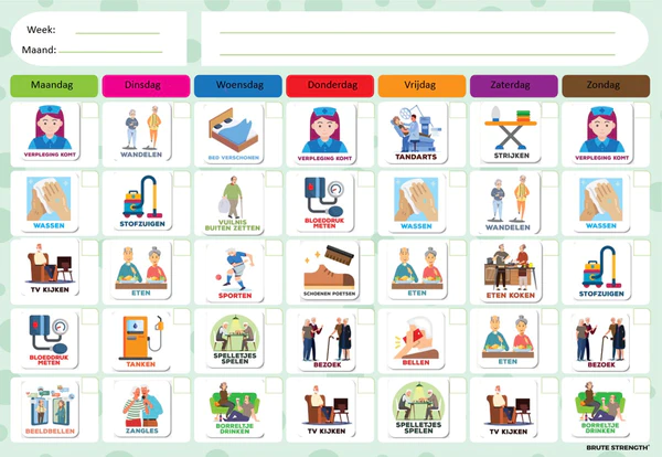 De pictogrammen zijn ontworpen met duidelijke, herkenbare afbeeldingen die het geheugen ondersteunen. Dit maakt ze ideaal voor mensen met geheugenproblemen, zoals bij beginnende dementie. Het systeem biedt een visuele en eenvoudige manier om dagelijkse routines te organiseren, wat zorgt voor rust en overzicht.